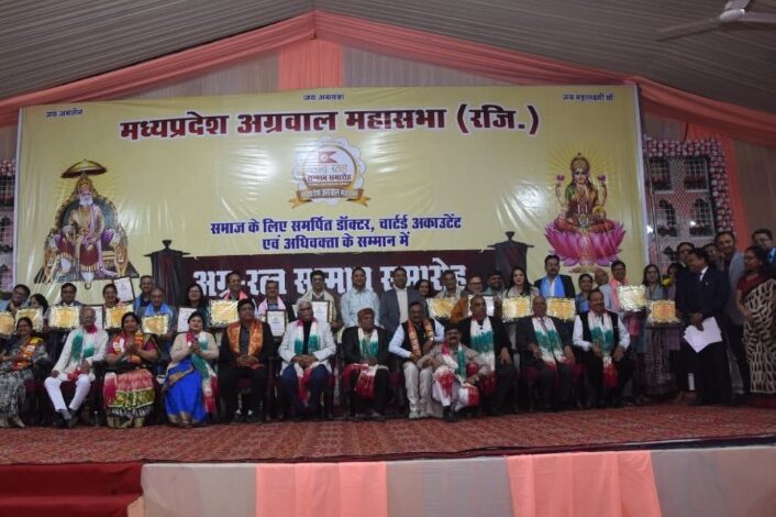 भोपाल। मध्य प्रदेश अग्रवाल महासभा द्वारा राजधानी भोपाल स्थित हिंदी भवन में अग्र रत्न सम्मान समारोह का भव्य आयोजन किया गया। समारोह में चिकित्सा, विधि एवं लेखा के क्षेत्र में उल्लेखनीय योगदान देने वाले 100 से अधिक डॉक्टरों, अधिवक्ताओं एवं चार्टर्ड अकाउंटेंट्स को सम्मानित किया गया। कार्यक्रम के मुख्य अतिथि महासभा के अध्यक्ष श्री कैलाश मित्तल रहे। समारोह में विशिष्ट अतिथि के रूप में सेवानिवृत्त न्यायमूर्ति श्री पी. सी. गुप्ता, मध्य प्रदेश अग्रवाल महासभा के पूर्व अध्यक्ष श्री गोविंद गोयल उपस्थित रहे। इस अवसर पर महासभा के महामंत्री श्री मुकेश गोयल, वरिष्ठ उपाध्यक्ष श्री नितिन कुमार गुप्ता, महिला अध्यक्ष श्रीमती रश्मि अग्रवाल एवं श्रीमती मीना बंसल की गरिमामयी उपस्थिति रही। कार्यक्रम के संयोजक श्री सुशील अग्रवाल एवं सह-संयोजक श्री धीरज अग्रवाल रहे।