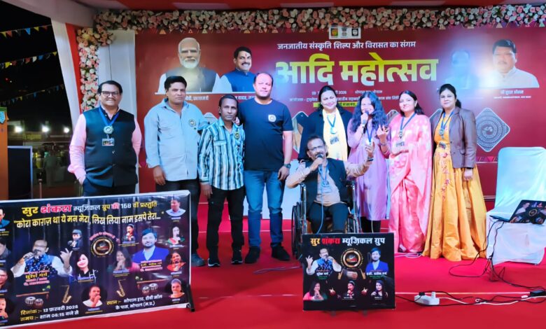 सुर शंकरा म्यूज़िकल ग्रुप के कार्य. अध्यक्ष/मैनेजर इंजी. प्रतीक गर्ग एवं प्रेरणास्रोत सीए. निहारिका गर्ग ने भोपाल हाट में सुर शंकरा ग्रुप की 12 फ़रवरी 2026 को सफलता पूर्वक सम्पन्न हुई 168वीं प्रस्तुति के लिये भारतीय जनजातीय सहकारी विपणन विकास संघ लिमिटेड (ट्राइफेड) का आभार व्यक्त करते हुए बताया कि इस “आदि महोत्सव” में जनजातीय संस्कृति शिल्प और विरासत का संगम दिखाई दिया जिसमें उत्तर पूर्वी राज्यों के साथ साथ मध्य प्रदेश, हिमाचल प्रदेश, आंध्र प्रदेश, छत्तीसगढ़, महाराष्ट्र, गुजरात, राजस्थान, पश्चिम बंगाल, कर्नाटक, तेलंगाना, उत्तराखंड, सिक्किम, लद्दाख के जनजातीय कारीगरों द्वारा निर्मित प्रमाणित उत्पाद का प्रदर्शन 5 दर्जन से अधिक लगाये गये स्टालों में नज़र आया जिसमें जनजातीय जीवनशैली, लोककला, आभूषण, वस्त्र, धातु शिल्प तथा हस्तनिर्मित कलाकृतियों की जीवंत झलक देख सुर शंकरा परिवार ने प्रशंसा व्यक्त की l सफल संगीतमय कार्यक्रम का नेतृत्व ग्रुप के संस्थापक/अध्यक्ष भजन लेखक सुरेश गर्ग द्वारा किया गया जिसमें कार्यक्रम की एंकरिंग ग्रुप की संभागीय अध्यक्ष सिंगर आयशा खान ने, लेपटॉप ऑपरेटिंग सिंगर परी अलीज़ा खान ने, कार्यक्रम की निगरानी जिला अध्यक्ष भोपाल फ़ाज़ील खान ने, वीडियोग्राफी सिंगर जावेद खान ने, साउंड ऑपरेटिंग सुमित भाई ने की कार्यक्रम की शुरुआत सिंगर्स शशिलता व अमिता बोरसे ने ज्योत से ज्योत जगाते चलो से की फ़िर उसके बाद लगातार एक से बढ़कर एक गीतों की श्रंखला में मास्टर अव्यान गर्ग ने संदेसे आते हैं, परी अलीज़ा खान ने बाबूजी धीरे चलना, आयशा खान ने तेरा साथ है तो मुझे क्या कमी है, निवेदिता व्यास ने आज कोई प्यार से, शशिलता ने बता दूँ क्या लाना तुम लौट के आ जाना, अमिता बोरसे ने अकेले ही अकेले चला है कहाँ, जावेद खान ने अपनी आँखों में बसाकर, इसरार खान ने हम तुम्हें चाहते हैं ऐसे, मेहमूद खान ने फूलों के रंग से दिल की क़लम से, बसंत बाथरे ने सांसों की ज़रूरत है जैसे, विवेक दुबे ने अभी मुझमें कहीं, दिलिप बोरसे ने सुन के तेरी पुकार, सुरेश गर्ग ने पल भर के लिये कोई हमें प्यार कर ले सहित युगल गीतों में कार्यक्रम का टाइटल गीत “कोरा काग़ज़ था ये मन मेरा, लिख लिया नाम इसपे तेरा” ग्रुप के अध्यक्ष सुरेश गर्ग व लेपटॉप ऑपरेटर परी अलीज़ा खान ने जब गाया तो दर्शकों ने जोरदार तालियां बजाई वहीं दूसरी तरफ़ सुरेश गर्ग ने शशिलता के साथ तुमने पुकारा और हम चले आये, अमिता बोरसे के साथ मैं न भूलूंगा मैं न भूलूंगी, एंकर आयशा खान के साथ फूल तुम्हें भेजा है ख़त में, अमिता बोरसे व दिलिप बोरसे ने हमसे भूल हो गई हमका माफ़ी देई दो, परी अलीज़ा खान व आयशा खान ने पान खाये सैया हमारो के अलावा ग्रुप के संस्थापक सुरेश गर्ग ने स्व-रचित 
