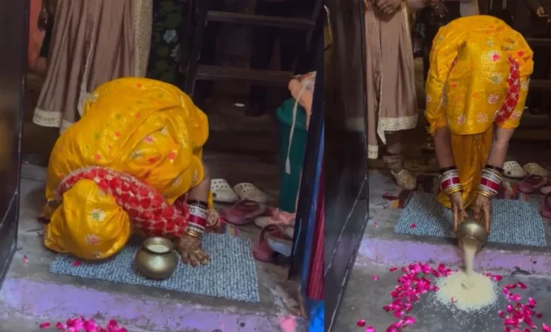 सोशल मीडिया पर एक दुल्हन का दिल खुश कर देने वाला वीडियो वायरल हो रहा है, जिसमें वो ससुराल में एंट्री से पहले चावल के लोटे को पैरों से गिराने के बजाय हाथ से गिराकर और घर को प्रणाम करके ही अंदर एंट्री लेती है. अब लोग कहने लगे हैं कि ऐसी संस्कारी बहू हर घर में होनी चाहिए.