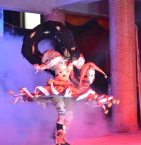हमने कृतिका और अभिरम नाम के दो अन्य डिजाइनरों से उनके डिजाइन के बारे में पूछा – “हम 6 लोगों की टीम हैं। इस परिधान को तैयार करने में हमें दो सप्ताह लगे। हमने पॉलिएस्टर कपड़ा, धातु का तार, जीआई तार, प्लास्टिक की गेंदें, चेन आदि सामग्री का उपयोग किया है। हमने सर्कस टेंट से प्रेरणा ली और हिंडोलों के प्रमुख रंग लाल और सफेद लिए”।