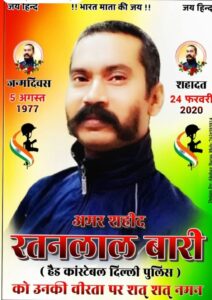 अमर शहीद फाउंडेशन के राष्ट्रीय महासचिव अरुण वर्मा ने 24 फरवरी 2020 को दिल्ली दंगा मे वीरता एवं साहस के साथ हजारों पब्लिक के सामने दंगाइयों से लोहा लेकर देश के लिए बलिदान देने वाले कानिस्टेबल अमर शहीद रतन लाल बारी जी को हृदय से नमन एवं श्रद्धांजलि अर्पित की है राष्ट्रीय महासचिव अरुण वर्मा ने कहा की देश के प्रति शहीद होने वाले जवान कभी मरते नही है वो अमर हो जाते हैं