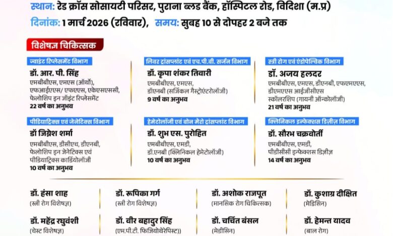 जन सुविधा के लिए भोपाल एवं विदिशा के विशिष्ट डॉक्टर्स की निशुल्क सेवाएं रेड क्रॉस भवन पुरानी अस्पताल के पास 1 मार्च को आयोजित शिविर में होगी उपलब्ध
