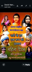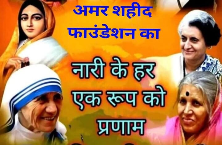 अमर शहीद फाउंडेशन ने देशवासियों को अंतर्राष्ट्रीय महिला दिवस की हार्दिक बधाई एवं शुभकामनाएं दी है राष्ट्रीय अध्यक्ष सुभाष शर्मा एवं राष्ट्रीय माहासचिव अरुण वर्मा ने बताया कि युगों युगों से समय समय पर अपनी प्रचण्ड शक्ति दिखाकर नारी शक्ति की पहचान बनाई है चाहे आदि शक्ति मां दुर्गा रही हों या झाँसी की रानी लक्ष्मी बाई रानी दुर्गा वती इन सबने अपनी प्रचंड शक्ति दिखाकर नारी शक्ति कि अलग विशिष्ट पहचान बनाई है यहां तक की श्रीमती इंद्रा गांधी जी ने अमेरिका की आखों मे आँख डालकर पाकिस्तान अमेरिका चीन को सबक सिखाया महान समाजसेवी मदर टेरेसा एवं सरोजनी नायडू ने अपनी एक अलग पहचान बनाई है इसी प्रकार बिंग कमांडर ब्योमिका सिंह सोफिया कुरैशी आपरेशन सिंदूर के तहत अपना साहस एवं शौर्य दिखा कर पाकिस्तान को औकात दिखा कर नारी शक्ति की एक विशेष पहचान बनाया है इससे प्रमाणित होता है कि दुनिया मे नारी शक्ति किसी से कम नही है अमर शहीद फाउंडेशन संसार की नारी शक्ति को अंतर्राष्ट्रीय महिला दिवस की हार्दिक बधाई एवं शुभकामनाएं