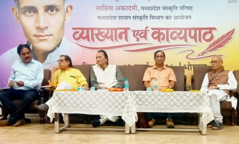 भोपाल | मुक्तिबोध सृजन पीठ द्वारा दुष्यंत कुमार पाण्डुलिपि संग्रहालय सभागार में आयोजित दो दिवसीय व्याख्यान एवं काव्य पाठ का आयोजन सम्पन्न हुआ, | कार्यक्रम के आरम्भ में मंचस्थ अतिथियों नें मां सरस्वती के चित्र पर माल्यार्पण एवं दीप प्रज्ववलन कर कार्यक्रम का शुभारम्भ किया, सभी कवियों को अंग वस्त्र भेंटकर मुक्तिबोध पीठ के निदेशक ऋषि कुमार मिश्रा ने स्वागत किया, घनश्याम मैथिल अमृत के संचालन में यह काव्य गोष्ठी आरम्भ हुई वरिष्ठ कवि