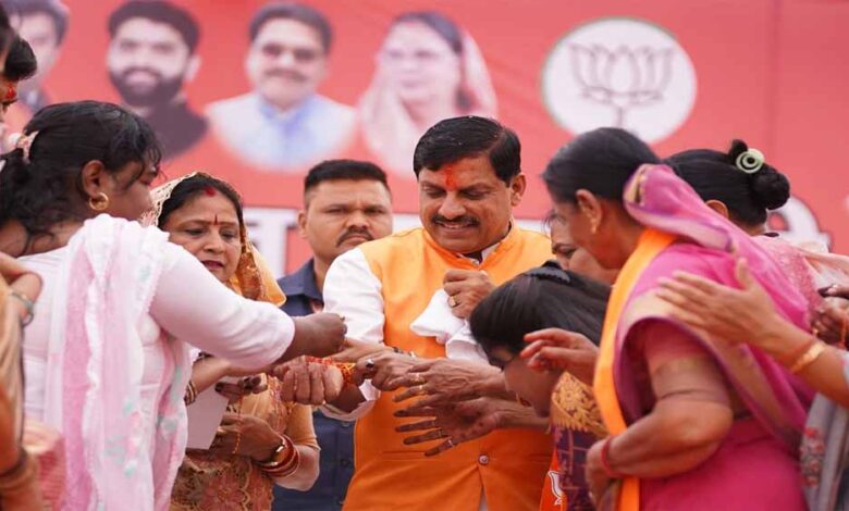 बिलहरा में आयोजित नारी शक्ति वंदन कार्यक्रम में पहुंचे डा. मोहन यादव ने भाईदोज पर बहनों से अपनी कलाई पर धागा बंधवाया