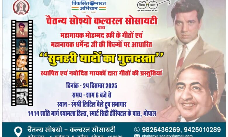 पद्मश्री मोहम्मद रफ़ी के गीतों और महानायक पद्मभूषण धर्मेंद्र पर आधारित, “सुनहरी यादों का गुलदस्ता “का आयोजन 24 दिसंबर 2025 को