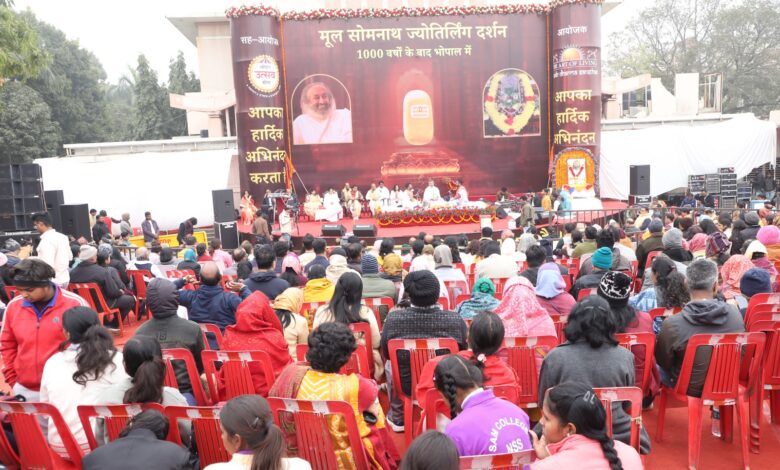 भोपाल। गुजरात स्थित देश के प्रथम ज्योतिर्लिंग सोमनाथ मंदिर से जुड़े एक हजार वर्ष पुराने चमत्कारिक शिवलिंग के पवित्र अंश का आज भोपाल में श्रद्धालुओं ने दुर्लभ दर्शन और का सौभाग्य प्राप्त हुआ। रवींद्र भवन के मुक्ताकाश मंच पर सोमनाथ ज्योतिर्लिंग के दिव्य पवित्र अंश के निर्मित शिवलिंग की सामूहिक रुद्र पूजा और दिव्य दर्शन का कार्यक्रम भोपाल उत्सव मेला और आर्ट ऑफ लिविंग के संयुक्त तत्वाधान में आयोजित हुआ। बेंगलुरू से आए वेदाचार्यों द्वारा ज्योर्तिलिंग का विधिवत रुद्र पूजा एवं वैदिक मंत्रोच्चारण किया गया। विधिवत रुद्र पूजा वैदिक मंत्रोच्चारण के साथ अनुष्ठान के यजमान से रूद्र पूजा करवाई गई। मंत्रों की गूंज से उपस्थित श्रद्धालु भाव-विभोर हो उठे और वातावरण पूर्णत: आध्यात्मिक अनुभूति से सराबोर हो गया। विधिवत पूजा-अर्चना और अभिषेक करते हुए शहवासियों को पांच घंटे तक दर्शन भी करवाए गए। हजारों श्रद्धालुओं ने लाइन में लगकर दर्शन लाभ लिए और परिसर में हर-हर महादेव की गूंज रही।