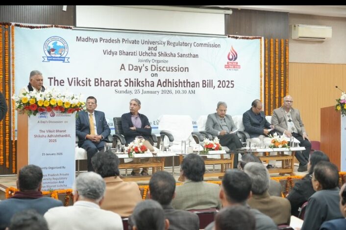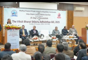 भोपाल। म.प्र. निजी विश्वविद्यालय विनियामक आयोग तथा विद्या भारती उच्च शिक्षा संस्थान के संयुक्त तत्वावधान में “विकसित भारत शिक्षा अधिष्ठान विधेयक 2025” विषय पर एक दिवसीय संविमर्श दिनांक 25 जनवरी, 2026 मध्यप्रदेश निजी विश्वविद्यालय विनियामक आयोग, भोपाल के सभागार में आयोजित किया गया। संविमर्श के उद्घाटन सत्र में कार्यक्रम के मुख्य अतिथि मध्यप्रदेश शासन के उच्च शिक्षा, तकनीकी शिक्षा एवं आयुष विभाग के मंत्री श्री इन्दर सिंह परमार थे। इस सत्र में विधेयक पर वक्तव्य विश्वविद्यालय अनुदान आयोग, नई दिल्ली के पूर्व अध्यक्ष प्रो. एम. जगदीश कुमार ने दिया। सत्र की अध्यक्षता हरियाणा हॉयर एजुकेशन कॉउंसिल के चेयरमेन प्रो. कैलाश चंद्र शर्मा ने की। इस अवसर पर विशिष्ट अतिथि के रूप में आयोग के सभापति प्रो. खेमसिंह डहेरिया, विद्या भारती उच्च शिक्षा संस्थान के राष्ट्रीय उपाध्यक्ष डॉ. शशिरंजन अकेला, आयोग के प्रशासनिक सदस्य श्री महेशचंद्र चौधरी एवं सचिव डॉ. देवेन्द्र सिंह गुर्जर मंचासीन थे।