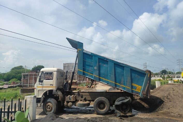 रेत खाली करता हाईवा ट्रांसमिशन लाइन से टकराया, टला बड़ा हादसा