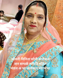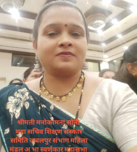 मनोकामना सोनी को जबलपुर संभाग महासचिव शिक्षण संस्कार समिति। विनिता सोनी जबलपुर, जन सम्पर्क समिति, प्रदेश संयोजक। आरती सोनी जबलपुर को जन सम्पर्क समिति प्रदेश संयुक्त सचिव, मीना सोनी, जन सम्पर्क समिति प्रदेश सह संयोजक के पद पर नियुक्त किया गया है। शिवानी ,जन सम्पर्क समिति ,नगर संगठन मंत्री।सुनिता सोनी जन सम्पर्क समिति में जिला सह संगठन मंत्री मनोनीत किया गया है। इन सब समाज सेवी बन्धुओं व नारी शक्ति के मनोनयन पर अ.भा. स्वर्णकार महासभा आपको हार्दिक बधाई और अनंत मंगल शुभकामनाएं देता है।आपसे उम्मीद करता है कि जो दायित्व आपको दिया गया है उसका पूर्ण रूप से निर्वहन करेंगे एवं स्वर्णकार समाज के उत्थान व संगठित बनाने में अपना योगदान देंगे। आपसे अनुरोध है की आप अपने कार्य प्रगति का ब्यौरा राष्ट्रीय अध्यक्ष/राष्ट्रीय महासचिव/प्रदेश अध्यक्ष जी को अवगत कराएंगे। आप सभी पदाधिकारी को अखिल भारतीय स्वर्णकार महासभा की ओर से एवं अन्य संगठनों तथा समाज के गणमान्य बंधुओ ने आपको शुभकामनाएं प्रदान की।
