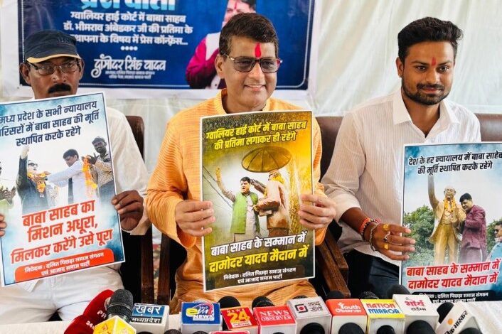 भोपाल। ग्वालियर हाईकोर्ट परिसर में भारतीय संविधान के निर्माता डॉ. भीमराव अंबेडकर की मूर्ति स्थापना को लेकर उपजे विवाद ने एक नया मोड़ ले लिया है। दलित पिछड़ा समाज संगठन के राष्ट्रीय अध्यक्ष एवं आजाद समाज पार्टी (भीम आर्मी) के वरिष्ठ नेता दामोदर सिंह यादव ने दो टूक कहा है कि “बाबा साहब की मूर्ति हाईकोर्ट परिसर में लगाकर रहेंगे।”