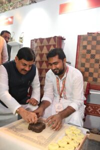 मुख्यमंत्री डॉ. मोहन यादव ने मध्यप्रदेश स्थापना दिवस के उद्घाटन समारोह में लाल परेड ग्राउंड,भोपाल में जहां मध्यप्रदेश के हस्तशिल्प, टेक्सटाइल और स्थानीय उद्योगों का प्रदर्शन किया गया। मुख्यमंत्री डॉ. यादव ने बाग प्रिंट के युवा शिल्पकार राष्ट्रीय एव अंतर्राष्ट्रीय पुरस्कार प्राप्त मोहम्मद बिलाल खत्री के स्टॉल का अवलोकन किया और खुद बाग प्रिंट का ठप्पा लगाकर इस पारंपरिक कला की महत्ता को रेखांकित किया। इस पर अवसर पर मंत्री एव अन्य गणमान्य जन उपस्थित थे।