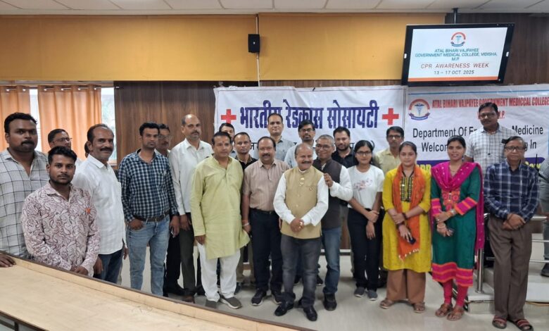 विदिशा। स्वास्थ्य एवं परिवार कल्याण मंत्रालय के निर्देशानुसार तथा भारतीय रेड क्रॉस सोसाइटी के सहयोग से सीपीआर जागरूकता सप्ताह (13 से 17 अक्टूबर 2025) के अंतर्गत गुरुवार, 16 अक्टूबर 2025 को अटल बिहारी वाजपेयी मेडिकल कॉलेज, विदिशा में एक दिवसीय सीपीआर (Cardio Pulmonary Resuscitation) प्रशिक्षण कार्यशाला का सफल आयोजन किया गया। राष्ट्रीय मीडिया प्रभारी अखिल भारतीय स्वर्णकार महासभा एवं लाइफ मेंबर रेड क्रॉस सोसाइटी लायन अरुण कुमार सोनी ने बताया कि इस कार्यशाला का उद्देश्य स्वास्थ्यकर्मियों, सुरक्षा सेवाओं, शासकीय कर्मचारियों एवं आम नागरिकों को जीवन रक्षक तकनीक सीपीआर के प्रति जागरूक करना तथा आपातकालीन परिस्थितियों में त्वरित सहायता प्रदान करने की क्षमता विकसित करना रहा।कार्यशाला में मेडिकल कॉलेज के डीन डॉ. मनीष निगम, रेड क्रॉस सोसाइटी जिला विदिशा के चेयरमैन डॉ. सचिन गर्ग, सचिव श्री संदीप उदयवाल सहित सदस्यगण अरुण कुमार सर्राफ सोनी, ऋषि जालोरी, प्रियंक सोनी, नितिन डोली, आनंद श्रीवास्तव, चंद्र मोहन, आर.के. कुलश्रेष्ठ, सुरेंद्र कुशवाहा, अग्रवाल, नारायणदास गोयल, दिनेश वर्मा, अनमोल उदयवाल, हेमंत राजोरिया, प्रवीण अवस्थी, रमेश कौड़की, दीपक शर्मा आदि उपस्थित रहे।