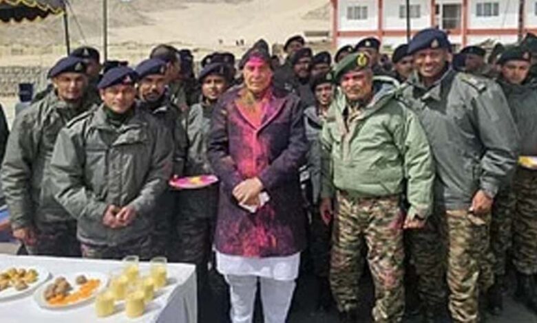 चीन सीमा पर लेह में तैनात जवानों को रंग-गुलाल लगाकर रक्षा मंत्री ने मनाई होली