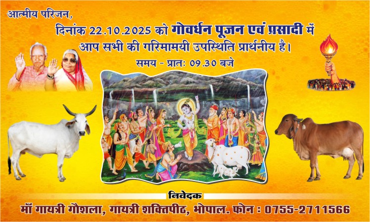 अखिल विश्व गायत्री परिवार की गोवर्धन पूजा गायत्री शक्तिपीठ भोपाल पर 22 अक्टूबर को प्रातः 9:00 बजे से भव्य गोवर्धन पूजा प्रतिवर्ष अनुसार इस वर्ष भी आयोजन किया गया है । पंचगव्य केंद्र के प्रभारी श्री सुभाष शर्मा जी ने बताया कि गोवर्धन पूजा में साक्षात् गौ माता एवं गाय के गोबर की विशाल गोवर्धन पर्वत की प्रतिमा बनाकर की वेदोक्त मंत्रोच्चार से पूजा कर पर्व संदेश एवं गौ पालन , संरक्षण, संवर्धन पर मार्गदर्शन एवं गो भक्तों का सम्मान किया जाएगा।