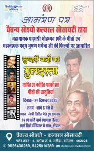 चैतन्य सोश्यो कल्चरल सोसायटी द्वारा दिनांक 24 दिसंबर 2025 को महान गायक स्व. मोहम्मद रफ़ी की जयंती के अवसर पर महानायक पद्मश्री मोहम्मद रफ़ी जी के गीतों और महानायक पद्मभूषण धर्मेंद्र जी की पर आधारित, “सुनहरी यादों का गुलदस्ता ” नामक विशेष कार्यक्रम आयोजित किया जा रहा है, जिसमें प्रोफेशनल और नवोदित गायक, गायिकाओं द्वारा रफ़ी जी के उन चुनिंदा गीतों का प्रदर्शन किया जायेगा जो धर्मेंद्र जी पर फिल्माये गये हैं । गीतों के माध्यम से महान नायक स्व . धर्मेंद्र जी और रफ़ी जी को श्रद्धांजलि अर्पित की जायेगी ।