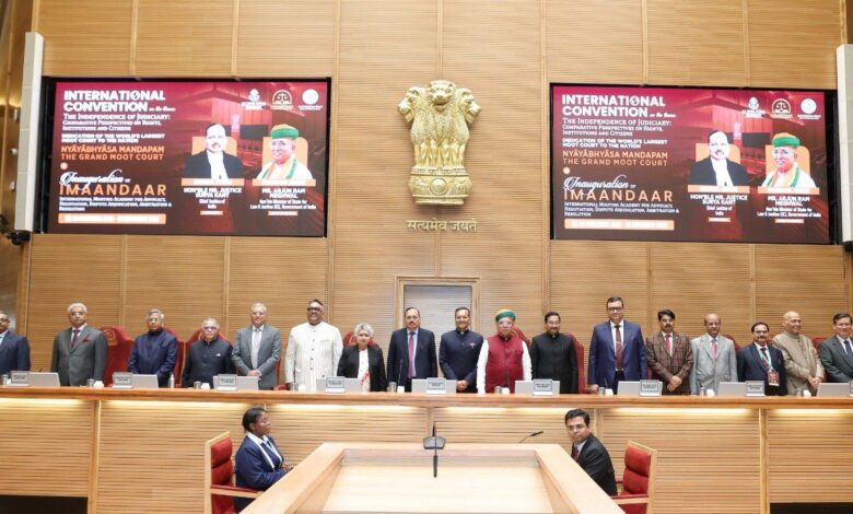 सोनीपत,’भारत के माननीय मुख्य न्यायाधीश, न्यायमूर्ति श्री सूर्य कांत, और माननीय कानून एवं न्याय राज्य मंत्री, श्री अर्जुन राम मेघवाल ने दुनिया की सबसे बड़ी अभ्यास अदालत, न्यायाभ्यास मंडपम – भव्य मूट कोर्ट का उद्घाटन किया और इसे राष्ट्र को समर्पित किया। इस आयोजन में देश-विदेश के 200 से अधिक न्यायाधीशों तथा न्यायविदों की उपस्थिति में ईमानदार (वकालत, बातचीत, विवाद निर्णय, मध्यस्थता एवं समाधान हेतु अंतर्राष्ट्रीय मूटिंग अकादमी) का भी शुभारंभ किया गया। इसके अलावा, भारत के माननीय मुख्य न्यायाधीश ने ओ.पी. जिंदल ग्लोबल यूनिवर्सिटी में ‘न्यायपालिका की स्वतंत्रता: अधिकारों, संस्थानों और नागरिकों पर तुलनात्मक विचार’ विषय पर अंतर्राष्ट्रीय सम्मेलन का भी उद्घाटन किया। इस खास मौके को यादगार बनाने के लिए माननीय मुख्य न्यायाधीश और कानून मंत्री ने एक पट्टिका का भी अनावरण किया।