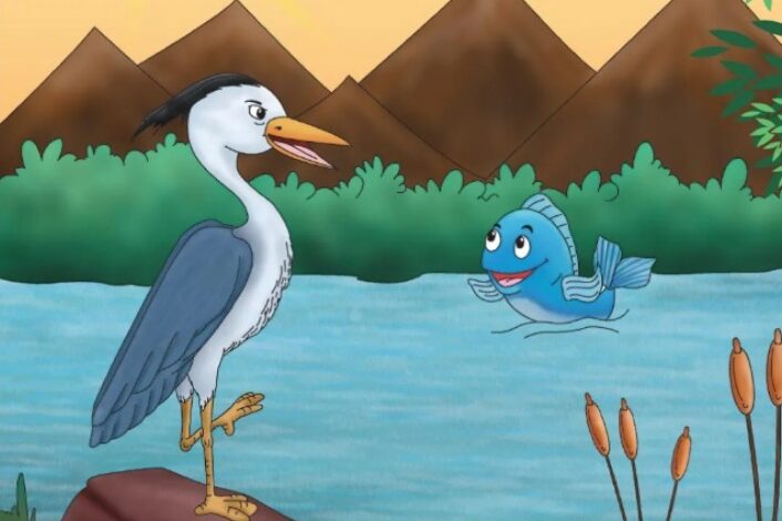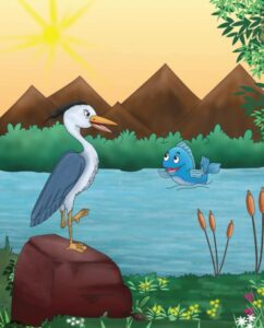 एक दिन वो किनारे पर सुरक्षित गहराई से झील के बाहर की दुनियाँ का अवलोकन कर रही थी कि उसे एक बगुले ने पुकारा