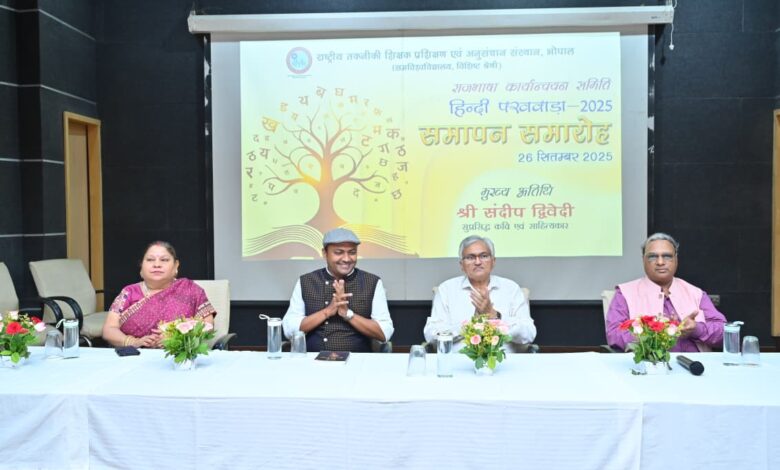 राष्ट्रीय तकनीकी शिक्षक प्रशिक्षण एवं अनुसंधान संस्थान (एनआईटीटीटीआर), भोपाल में 10 से 26 सितंबर 2025 तक हिंदी पखवाड़ा का आयोजन किया, जिसमें विभिन्न प्रतियोगिताओं और गतिविधियों के माध्यम से हिंदी भाषा के महत्व को रेखांकित किया गया। इस आयोजन में हिंदी कार्यशाला, निबंध प्रतियोगिता, चित्र देखो कहानी लिखो, स्वरचित आशु-कविता प्रतियोगिता, श्रुत-लेख प्रतियोगिता, कॉसवर्ड प्रतियोगिता, हास्य कविता, तात्कालिक भाषण, और प्रश्न मंच जैसी गतिविधियाँ शामिल थीं। हिंदी पखवाड़ा समापन समारोह के मुख्य अतिथि सुप्रसिद्ध कवि और साहित्यकार श्री संदीप द्विवेदी थे व कार्यक्रम की अध्यक्षता संस्थान के निदेशक और नराकास के अध्यक्ष प्रो. चंद्र चारु त्रिपाठी ने की व विशिष्ट अतिथि के रूप में श्रीमती वंदना त्रिपाठी उपस्थित थी। श्री संदीप द्विवेदी ने अपने चित परिचित अंदाज़ में “रोने से कुछ होता है क्या”, “बेमन भी रहना होता है”, जैसी अपनी रचनायें सुनाई व संस्थान की प्रशंसा करते हुए कहा कि तकनीकी संस्थान होने के बाद भी निटर भोपाल राजभाषा के प्रचार-प्रसार में निरंतर सक्रिय है। आमतौर पर तकनीकी संस्थानों से हिंदी में कार्यों की अपेक्षा कम होती है, किन्तु निटर भोपाल ने हिंदी के विभिन्न मंचो पर अपनी उपस्थिति दर्ज कर इस भ्रम को तोड़ा है। साहित्यकारों को पुस्तकालयों में होना चाहिए, संग्रहालयों में नहीं। संस्थान निदेशक प्रो. त्रिपाठी ने कहा कि हिंदी केवल एक भाषा नहीं, बल्कि यह हमारे देश की आत्मा और संस्कृति की अभिव्यक्ति है। हिंदी हमारी परंपराओं, संस्कृतियों, और विचारों को साझा मंच पर लाती है, और यही कारण है कि यह न केवल भारत में, बल्कि अंतरराष्ट्रीय स्तर पर भी तेजी से फैल रही है। राजभाषा समन्वयक डॉ. पी.के. पुरोहित ने संस्थान की राजभाषा की उपलब्धियों का वर्णन करते हुए कहा कि गत दो वर्षों में हिंदी के क्षेत्र में उत्कृष्ट कार्य करने के लिए संस्थान को कई मंचों से पुरस्कार और सम्मान प्राप्त हुए हैं एवं संसदीय समिति द्वारा किए गए निरीक्षण में भी सराहना मिली है। हमें यह सुनिश्चित करना होगा कि हिंदी न केवल हमारे जीवन का हिस्सा बने, बल्कि हर मंच पर उसे उचित सम्मान भी मिले। कार्यक्रम का संचालन श्रीमती शोभा लेखवानी व श्री संजय त्रिपाठी द्वारा किया गया। कार्यक्रम के समापन पर प्रतियोगिताएं के विजेताओं को पुरस्कार प्रदान किए गए।