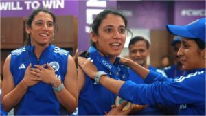 मैच के बाद टीम इंडिया के फील्डिंग कोच मुनीश बाली ने खिलाड़ियों की तारीफ करते हुए ‘बेस्ट फील्डर’ मेडल स्मृति मंधाना को दिया। इस मौके पर टीम की साथी खिलाड़ी जेमिमा रोड्रिग्स ने मंधाना को मजाकिया अंदाज में छेड़ते हुए कहा, ‘यह लड़की तो कई दिनों से बाली सर को बोल रही थी कि मुझे मेडल दो, मुझे मेडल दो। लेकिन आज वाकई इसने मेहनत से मेडल हासिल किया है।’भारत और न्यूजीलैंड की महिला टीमों के बीच हुए विश्व कप मुकाबले में स्मृति मंधाना ने शानदार प्रदर्शन करते हुए अपनी फील्डिंग से सबका दिल जीत लिया। नवी मुंबई के डीवाई पाटिल स्टेडियम में खेले गए मैच में मंधाना ने न केवल 109 रनों की शानदार पारी खेली, बल्कि फील्ड पर भी तीन अहम कैच पकड़कर भारत की जीत में बड़ी भूमिका निभाई। भारत ने यह मैच डीएलएस नियम के तहत 53 रनों से जीतकर सेमीफाइनल में जगह बना ली।जेमिमा की इस बात पर पूरी टीम हंसी से गूंज उठी। मंधाना ने भी खुशी जाहिर करते हुए कहा, ‘टीम में जबसे मेडल देना शुरू हुआ है, ढाई साल हो गए, पहली बार मिला है।’ भारतीय क्रिकेट कंट्रोल बोर्ड (बीसीसीआई) ने ड्रेसिंग रूम का वीडियो अब जारी किया है। भारत की निगाहें लीग स्टेज के आखिरी मुकाबले पर हैं, जहां टीम रविवार को नवी मुंबई में बांग्लादेश टीम से भिड़ेगी।