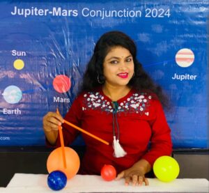 सारिका ने बताया कि जोड़ी बनाते इन ग्रहों में मंगल पृथ्वी से लगभग 22 करोड़ किमी से अधिक दूर होगा तो बृहस्पति 80 करोड़ किमी से अधिक दूर होगा । दूरी में इतना अंतर होते हुये भी पृथ्वी से देखने पर इनका कोण इस प्रकार होगा कि वे जोड़ी के रूप मे एक दूसरे मे समाते दिखेंगे ।