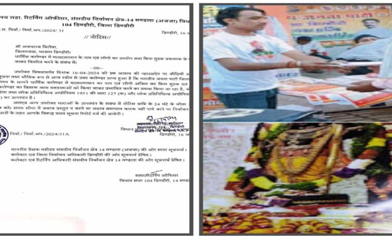 जिस पर जिलाध्यक्ष भारतीय जनता पार्टी जिला डिण्डौरी को आदर्श आचरण संहिता का उल्लघंन एवं लोक प्रतिनिधित्व अधिनियम 1951 की धारा 127क एवं धारा 123(3) के प्रावधानों के तहत सहायक रिटर्निंग अधिकारी डिंडोरी द्वारा नोटिस जारी किया गया है। नोटिस प्राप्ति के 24 घंटे के अंदर जबाव मांगा गया है, समय सीमा में अभाव प्रस्तुत न करने या जवाब समाधान कारक नहीं पाये जाने पर निर्वाचन अपराधों के सुसंगत प्रावधानों के तहत प्रथम सूचना रिपोर्ट दर्ज करने की कार्यवाही की जाएगी।