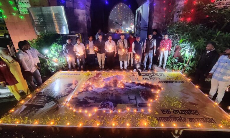 इस अवसर पर रंगोली में मध्यप्रदेश का नक्शा एवं लोहपुरुष सरदार वल्लभ भाई पटेल जी का चित्र बनाकर दीप प्रज्वलित किए गए।
