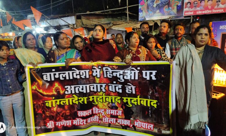 बांग्लादेश में हिंदुओं पर हो रहे अत्याचार के विरोध में आज भोपाल गणेश मंदिर छोला नाका पर सकल हिंदू समाज द्वारा जन-आक्रोश रैली निकाली और बंगलादेश मे जिंदा जला दिए गए हमारे हिन्दू भाई दीपूचन्द्र दास जी को श्रधांजलि अर्पित की गई तथा गौतम नगर थाना प्रभारी जी को माननीय प्रधानमंत्री नरेंद्र मोदी जी के नाम बंगला देश मे हिन्दुओ पर अत्याचार रोकने के लिए उचित कार्यवाही हेतु ज्ञापन सौंपकर विरोध दर्ज कराया ! इस अवसर पर सेकड़ो की संख्या में नागरिक बंधु , माताएं बहने उपस्थित रही। इस अवसर पर प्रमुख रूप से वरिष्ठ समाज सेवी महेश राठौर जी, राजेश मैथिल जी, मुकेश मेर, पुरन कनोजिया, जुगल किशोर श्रीवास , राजेश कनोजिया, बसंत गोस्वामी, अशोक कुशवाह, चित्तर श्रीवास, अनिल चौहान, महेंद्र कुशवाह, गीता माली, मनोज कुशवाह, हेमराज सिंह मेर, दुर्गेश कुशवाह, राहुल भदौरिया, रोहित सावले, सरस्वती सेंगर, गुलाब मौर्य, आदि नागरिक बंधु उपस्थित रहे।