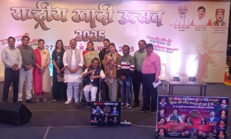 भोपाल l म. प्र. खादी तथा ग्रामोद्योग बोर्ड द्वारा डी. बी. मॉल के पास भोपाल हाट में संचालित “राष्ट्रीय खादी उत्सव 2025” में सुर शंकरा म्यूज़िकल ग्रुप की 156वीं संगीतमयी प्रस्तुति “घूँघरू की तरह बजता ही रहा हूँ मैं… ” सफलतापूर्वक सम्पन्न हुई l जिसमें मध्य प्रदेश शासन के कुटीर एवं ग्रामोद्योग राज्य मंत्री माननीय दिलिप जायसवाल, विशेष कर्तव्यस्थ अधिकारी बसंत बाथरे, निज सहायक आशीष चेके, मेला अधिकारी नीरज उइके की गरिमामयी उपस्थिति ने कार्यक्रम की शोभा बढ़ाई l