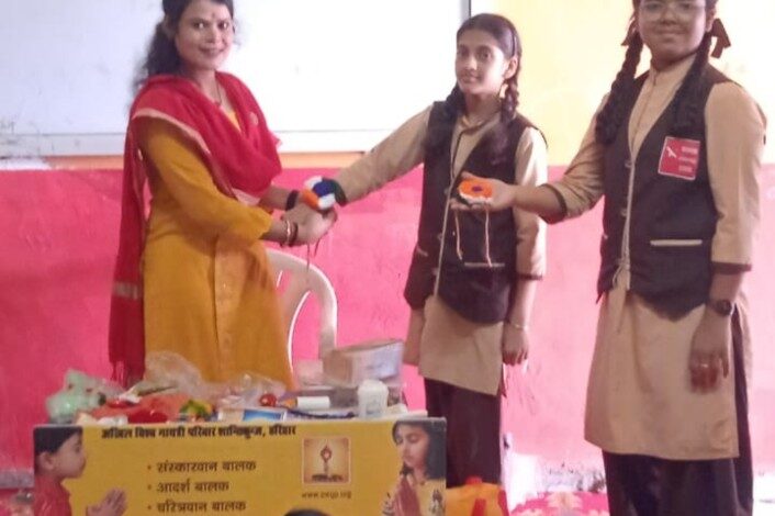 आज गायत्री परिवार युवा प्रकोष्ठ भोपाल द्वारा वंडर इंटरनेशनल स्कूल दानिश नगर रजत विहार भोपाल में स्वदेशी राखी बनाने का ऑफलाइन, ऑनलाइन प्रशिक्षण युवा प्रकोष्ठ की सीमा भलावी, सुनीता गुप्ता एवं उनकी टीम के द्वारा दिया गया साथ में स्वदेशी राखी घर पर ही स्वयं की बहनों के हाथ से वनी राखी सुंदर ,सस्ती साथ में रक्षाबंधन भाई बहन के पावन पर्व का महत्व एवं सार्थकता महत्व बताते हुए । बहन अपने भाई की कलाई पर राखी बांधते समय बहन अपने भाइयों से एक बुराई रूपी व्यशन, बुरी आदत (नशा)छोड़ने का संकल्प लेकर राखी बंधेगी और एक नया संकल्प अपनी बहन के नाम एक वृक्ष लगाने का संकल्प लेगी ऐसा संदेश दिया गया। इस प्रशिक्षण अवसर पर प्राचार्य श्री दीपक गुप्ता ने विद्यालय के छात्र छात्राओं को इस प्रशिक्षण से सीख लेकर प्रशिक्षक द्वारा बताए हुए उद्देश्य को अपने व्यवहारिक जीवन में अपनाने की बात कही उन्होंने गायत्री परिवार द्वारा चलाए जा रहे हैं ऐसे रचनात्मक अभियानों की सराहना की और सीमा भलावी प्रशिक्षिका का सम्मान किया गया। इस अवसर पर स्कूल की शिक्षाएं युक्तासिंह सुनीता गुप्ता, दीक्षा, निधि बहनजी सम्मलित हुई