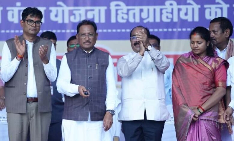 ख्यमंत्री श्री विष्णुदेव साय ने आज रायगढ़ जिले के खरसिया में आयोजित भव्य कार्यक्रम में महतारी वंदन योजना की 19वीं किस्त का भुगतान करते हुए प्रदेश की 69,15,994 महिलाओं के खातों में 1000-1000 रुपये की राशि अंतरित की। इस अवसर पर उप मुख्यमंत्री श्री अरुण साव, वित्त मंत्री श्री ओ.पी. चौधरी और महिला एवं बाल विकास मंत्री श्रीमती लक्ष्मी राजवाड़े भी उपस्थित रहीं।