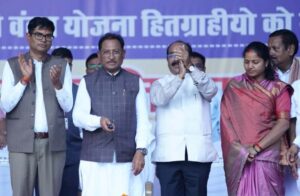 ख्यमंत्री श्री विष्णुदेव साय ने आज रायगढ़ जिले के खरसिया में आयोजित भव्य कार्यक्रम में महतारी वंदन योजना की 19वीं किस्त का भुगतान करते हुए प्रदेश की 69,15,994 महिलाओं के खातों में 1000-1000 रुपये की राशि अंतरित की। इस अवसर पर उप मुख्यमंत्री श्री अरुण साव, वित्त मंत्री श्री ओ.पी. चौधरी और महिला एवं बाल विकास मंत्री श्रीमती लक्ष्मी राजवाड़े भी उपस्थित रहीं।