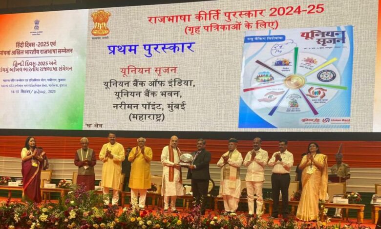 मुंबई, 18 सितंबर, 2025: यूनियन बैंक ऑफ इंडिया को भारत सरकार के गृह मंत्रालय द्वारा वित्तीय वर्ष 2024-25 के लिए कीर्ति पुरस्कार प्रदान किया गया. बैंक को यह प्रतिष्ठित पुरस्कार दो अलग-अलग श्रेणियों में प्राप्त हुआ: उत्कृष्ट राजभाषा कार्यान्वयन और सर्वश्रेष्ठ गृह पत्रिका – यूनियन सृजन. माननीय केंद्रीय गृह एवं सहकारिता मंत्री श्री अमित शाह द्वारा गृह पत्रिका यूनियन सृजन में प्रथम पुरस्कार के लिए बैंक को कीर्ति पुरस्कार प्रदान किया गया. यह पुरस्कार बैंक के कार्यपालक निदेशक श्री नितेश रंजन द्वारा 14.09.2025 को गांधीनगर, गुजरात में आयोजित 5वें अखिल भारतीय राजभाषा सम्मेलन में प्राप्त किया गया. माननीय केंद्रीय विधि एवं न्याय राज्य मंत्री श्री अर्जुन राम मेघवाल और माननीय राज्यसभा सांसद श्री दिनेश शर्मा ने वर्ष 2024-25 के दौरान उत्कृष्ट राजभाषा कार्यान्वयन हेतु बैंक को कीर्ति पुरस्कार प्रदान किया. यह पुरस्कार बैंक के मुख्य महाप्रबंधक, मानव संसाधन (मानव संसाधन) श्री सुरेश चंद्र तेली द्वारा ग्रहण किया गया. राजभाषा कीर्ति पुरस्कार, गृह मंत्रालय, भारत सरकार द्वारा हिंदी भाषा के प्रभावी कार्यान्वयन और प्रचार-प्रसार के लिए मंत्रालयों, विभागों, सार्वजनिक क्षेत्र के उपक्रमों, बैंकों, निगमों और पत्रिकाओं को दिया जाने वाला सर्वोच्च पुरस्कार है. कार्यक्रम के दौरान, बैंक द्वारा प्रकाशित पुस्तक “यूनियन भाषा वैभव” और “2047 विकसित भारत की अवधारणा में बैंकों की भूमिका” का मंच पर उपस्थित गणमान्य व्यक्तियों द्वारा विमोचन किया गया. अखिल भारतीय राजभाषा सम्मेलन के दूसरे दिन, यूनियन बैंक ऑफ इंडिया द्वारा सभी 12 सार्वजनिक क्षेत्र के बैंकों के सहयोग से तैयार एक प्रार्थना गीत प्रस्तुत किया गया. साथ ही, यूनियन बैंक ऑफ इंडिया के संयोजकत्व में कार्यरत 11 नगर राजभाषा कार्यान्वयन समितियों (टीओएलआईसी) को राजभाषा विभाग द्वारा उत्कृष्ट प्रदर्शन के लिए सम्मानित किया गया.