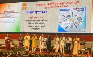 मुंबई, 18 सितंबर, 2025: यूनियन बैंक ऑफ इंडिया को भारत सरकार के गृह मंत्रालय द्वारा वित्तीय वर्ष 2024-25 के लिए कीर्ति पुरस्कार प्रदान किया गया. बैंक को यह प्रतिष्ठित पुरस्कार दो अलग-अलग श्रेणियों में प्राप्त हुआ: उत्कृष्ट राजभाषा कार्यान्वयन और सर्वश्रेष्ठ गृह पत्रिका – यूनियन सृजन. माननीय केंद्रीय गृह एवं सहकारिता मंत्री श्री अमित शाह द्वारा गृह पत्रिका यूनियन सृजन में प्रथम पुरस्कार के लिए बैंक को कीर्ति पुरस्कार प्रदान किया गया. यह पुरस्कार बैंक के कार्यपालक निदेशक श्री नितेश रंजन द्वारा 14.09.2025 को गांधीनगर, गुजरात में आयोजित 5वें अखिल भारतीय राजभाषा सम्मेलन में प्राप्त किया गया. माननीय केंद्रीय विधि एवं न्याय राज्य मंत्री श्री अर्जुन राम मेघवाल और माननीय राज्यसभा सांसद श्री दिनेश शर्मा ने वर्ष 2024-25 के दौरान उत्कृष्ट राजभाषा कार्यान्वयन हेतु बैंक को कीर्ति पुरस्कार प्रदान किया. यह पुरस्कार बैंक के मुख्य महाप्रबंधक, मानव संसाधन (मानव संसाधन) श्री सुरेश चंद्र तेली द्वारा ग्रहण किया गया. राजभाषा कीर्ति पुरस्कार, गृह मंत्रालय, भारत सरकार द्वारा हिंदी भाषा के प्रभावी कार्यान्वयन और प्रचार-प्रसार के लिए मंत्रालयों, विभागों, सार्वजनिक क्षेत्र के उपक्रमों, बैंकों, निगमों और पत्रिकाओं को दिया जाने वाला सर्वोच्च पुरस्कार है. कार्यक्रम के दौरान, बैंक द्वारा प्रकाशित पुस्तक “यूनियन भाषा वैभव” और “2047 विकसित भारत की अवधारणा में बैंकों की भूमिका” का मंच पर उपस्थित गणमान्य व्यक्तियों द्वारा विमोचन किया गया. अखिल भारतीय राजभाषा सम्मेलन के दूसरे दिन, यूनियन बैंक ऑफ इंडिया द्वारा सभी 12 सार्वजनिक क्षेत्र के बैंकों के सहयोग से तैयार एक प्रार्थना गीत प्रस्तुत किया गया. साथ ही, यूनियन बैंक ऑफ इंडिया के संयोजकत्व में कार्यरत 11 नगर राजभाषा कार्यान्वयन समितियों (टीओएलआईसी) को राजभाषा विभाग द्वारा उत्कृष्ट प्रदर्शन के लिए सम्मानित किया गया.