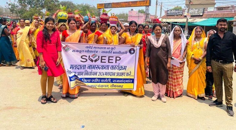जिले में स्वसहायता समूह की महिलाएं विभिन्न कार्यक्रमों के माध्यम से ग्रामीण मतदाताओं को मतदान दिवस 26 अप्रैल को मतदान केन्द्र पहुंचकर मताधिकार का उपयोग करने के लिए प्रेरित कर रही है। अविभाजित राजनांदगांव जिले के सभी विकासखंडों में विगत 7 दिवस में ग्राम बागनदी, मोहला, भर्रीटोला, देवरसूर, कुदुम्कासा, जोबटोला, देवकट्टा, रूवाताला, मुसराकला, रामगढ़, आमाटोला, हाथीकन्हार, सांकरदाहरा, उसरीबोड़, मार्कनपुर सहित 89 से अधिक ग्रामों में लगभग 15 हजार से अधिक स्वसहायता समूह की महिलाओं द्वारा मतदाता जागरूकता कार्यक्रम अंतर्गत ग्राम संगठन स्तर पर वोट वचन का शपथ लिया गया और शपथ लेने का कार्य निरंतर जारी है। महिला स्वसहायता समूह की सदस्यों द्वारा मतदान दिवस 26 अप्रैल 2024 को लोकसभा निर्वाचन में वोट देकर अपने मताधिकार का उपयोग करने, साथ ही अपने परिवार, रिश्तेदारों एवं पड़ोसियों को शत-प्रतिशत वोट डालने के लिए प्रेरित करने का वोट वचन का शपथ ले रहीं है। महिलाओं द्वारा ग्रामीणों को लोकतंत्र में मतदान के अधिकार तथा मतदान का उपयोग करने के संबंध में ग्रामीणों को प्रेरित और शत प्रतिशत मतदान के लिए जागरूक किया जा रहा है।